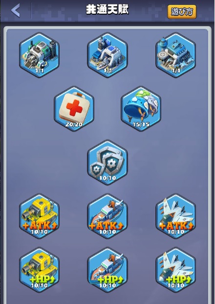 | lv | 増加量 | 石油 | 食料 | 追加戦力 | 研究時間 |
