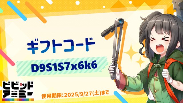 | D9S1S7x6k6 | 橙色破片×1、食料石油選択箱(1M)×2、ユニット選択箱×2、ユニーク選択箱×2、ダイヤ1000 | 期限2025/6/27/19:30〜2025/9/28/0:55 |