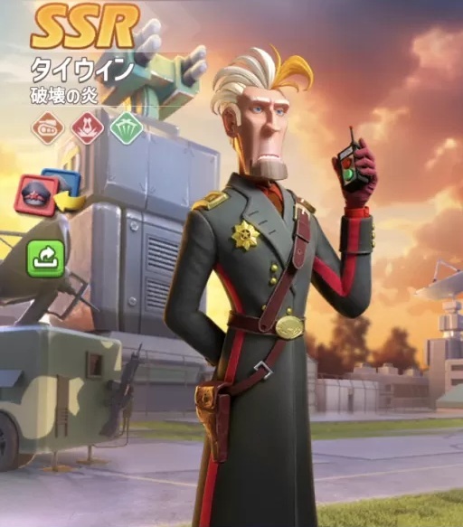 ![]() | 味方2列目の陸軍ユニットが通常攻撃後、ランダムな敵ユニット5体にスキル攻撃を行い、それぞれに 38.0%のダメージを与え、さらに40.0%の【脆弱】効果を1つ与える |