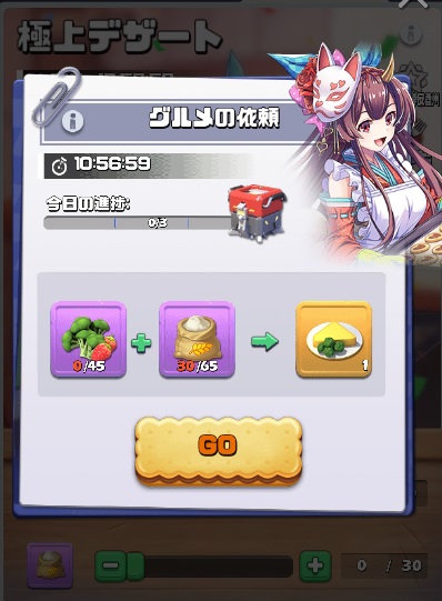 | 【スイーツマニア】 デザートを1回完成させる | グルメBOXx1 | 食料100Kx1 | 石油100Kx1 |